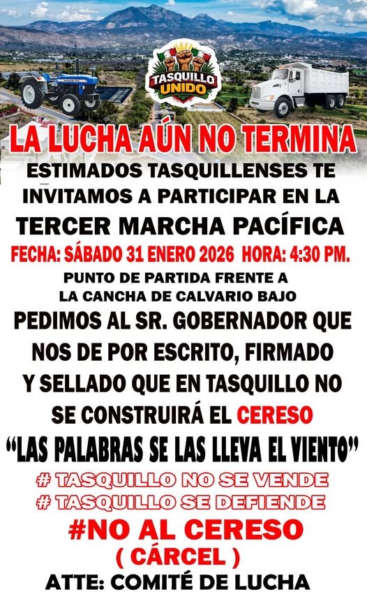 La movilización, impulsada por Tasquillo Unido y el Comité de Lucha, se realizará este sábado 31 de enero de 2026, a partir de las 4:30 de la tarde, con punto de partida frente a la cancha de Calvario Bajo. El mensaje central es directo y contundente: exigir al gobernador de Hidalgo, Julio Menchaca, un documento oficial, firmado y sellado, que garantice que el CERESO no se construirá en Tasquillo.